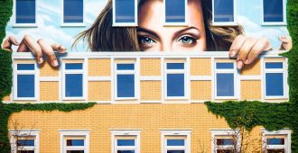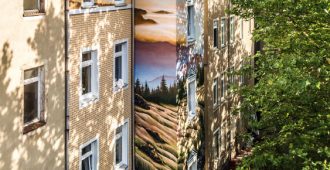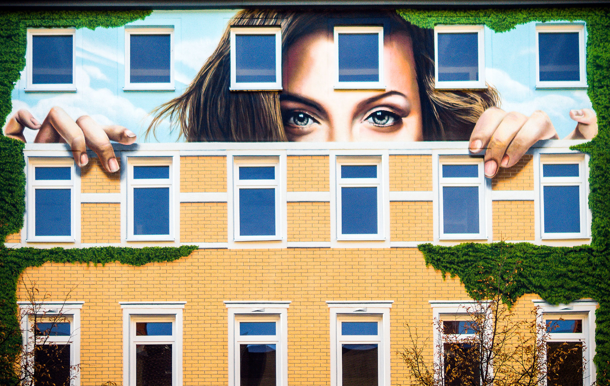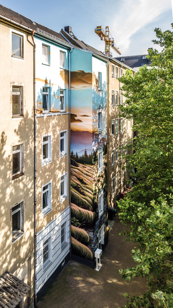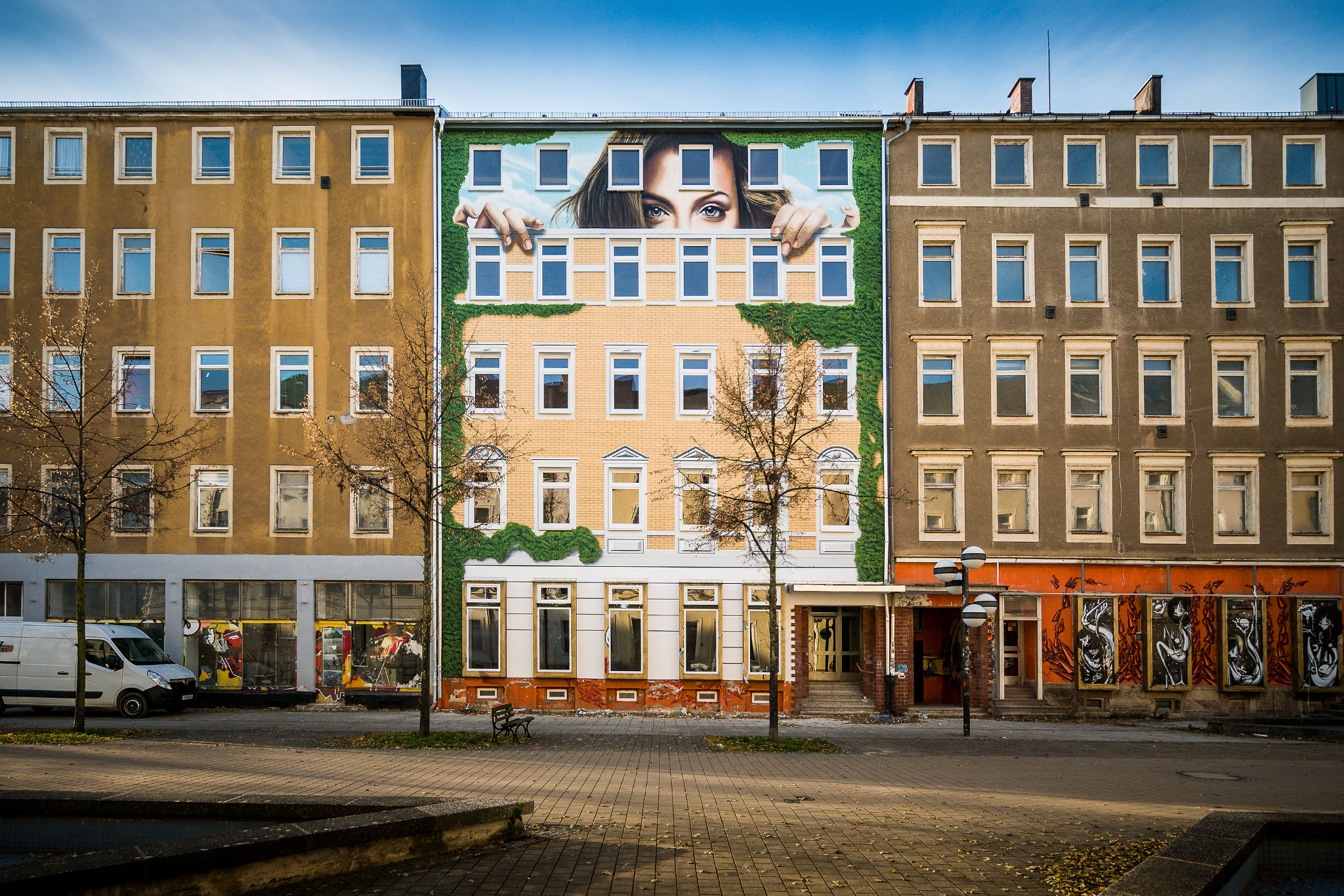 Was passiert mit dem einst verwaisten Brühl Boulevard in Chemnitz? Wird es die lang ersehnte Belebung geben? Diese Illusionsmalerei am ersten Haus der bemalten Häuserzeile am Boulevard stellt eine Frau dar, die neugierig über die begrünten Mauern in eine hoffnungsvolle Zukunft schaut. Es handelt sich hierbei um eine freie Auftragsarbeit der Künstler Markus Esche und Guido Günther. Das Objekt Brühl 69 ist das erste Haus eines Ensembles von fünf gestalteten Häusern am Brühl Boulevard in Chemnitz.