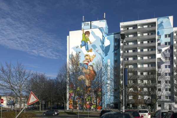 Das Künstlerduo HomBoog widmet sich in seinem Abschnitt dem Thema Familie & Kinder als Bestandteil des lebendigen Boulevards und Spiegel der vielen verschieden Projekte im Stadtteil. So erobert eine Gruppe kleiner Wilder im Team die Mauern des Hauses. Unter Zuhilfenahme unzähliger Urbaner Gegenstände nehmen sie das Hochhaus als Sinnbild des Boulevards, für sich ein. Sie symbolisieren die Zurückeroberung des lange lehrstehenden Brühls durch Kinder und sind somit Zeichen eines Boulevards für Familien