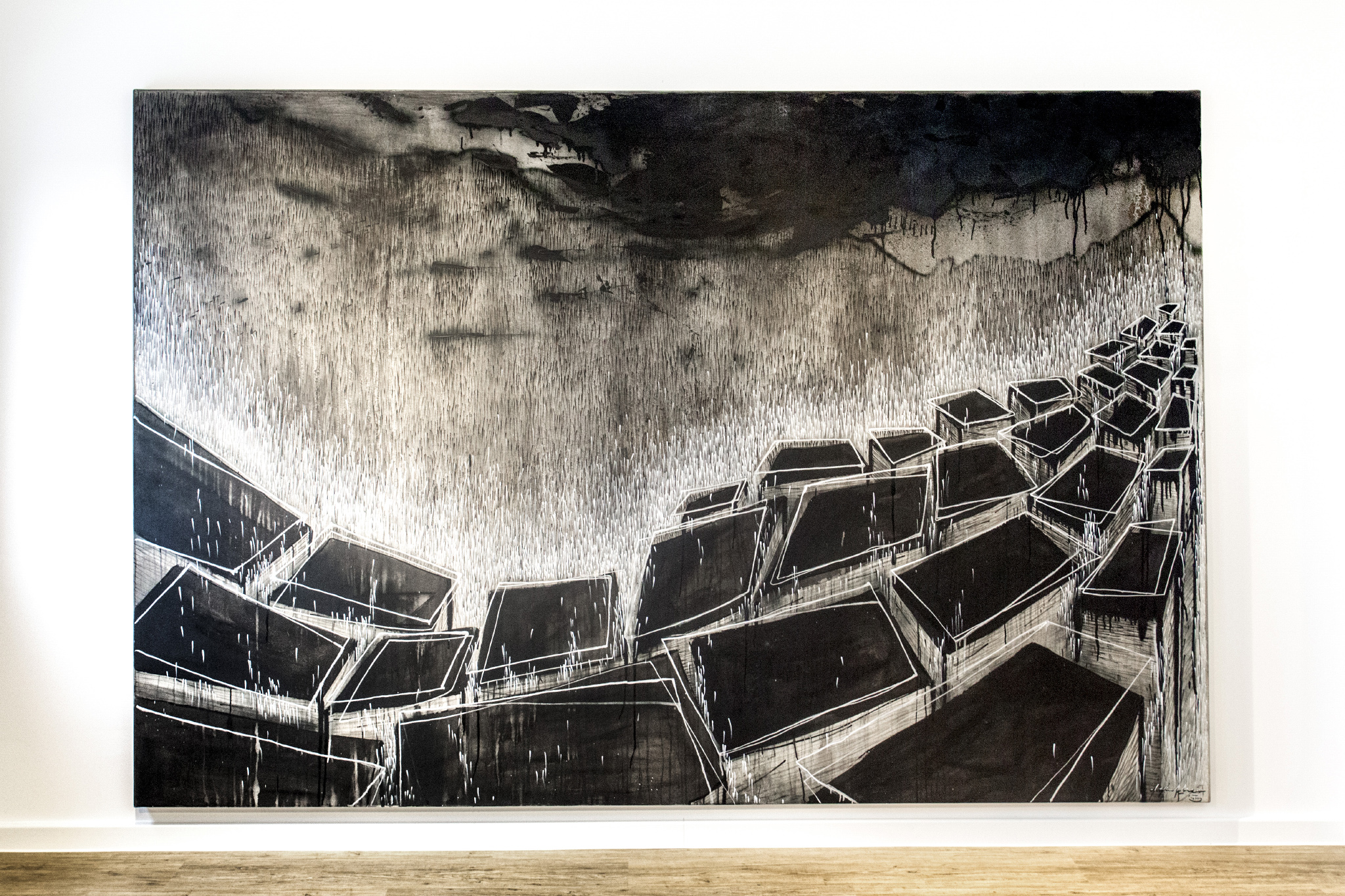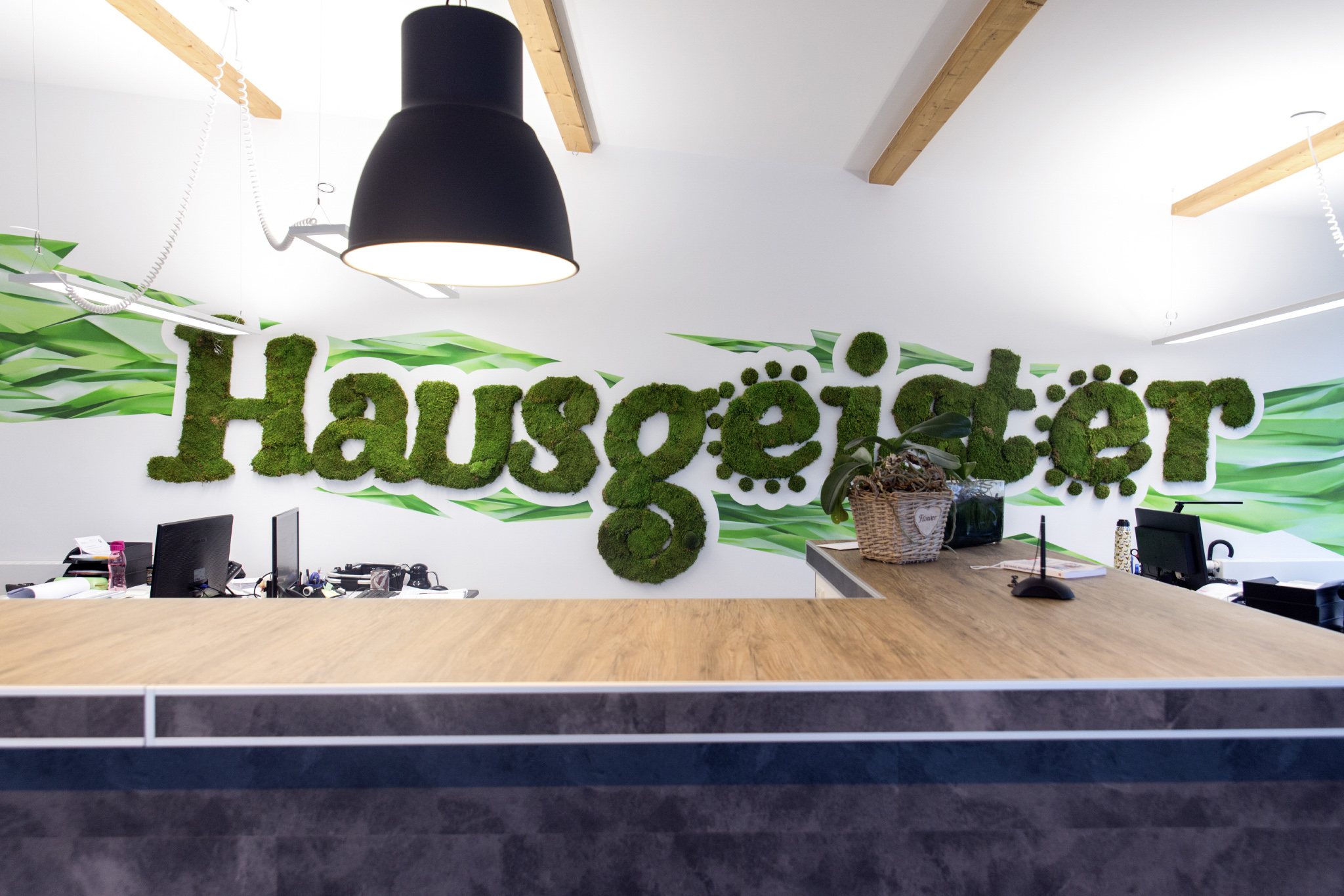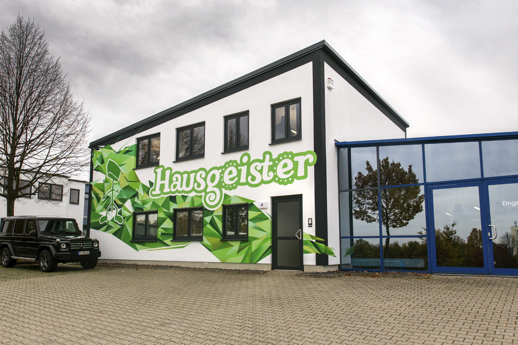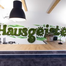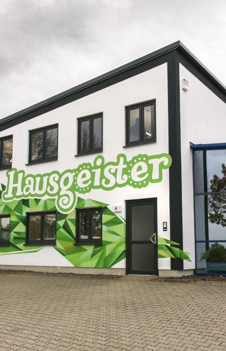 Die Gestaltung des neuen Firmensitzes der Firma Hausgeister GmbH vereinte für uns Installation und Malerei. Neben der plakativen Gestaltung der Fassade integrierten wir im Empfangsbereich des Unternehmens ein 3D Logo aus stabilisierten Mosen. Einzelne Büros wurden mit Leinwandarbeiten von Guido Günther ausgestattet.