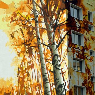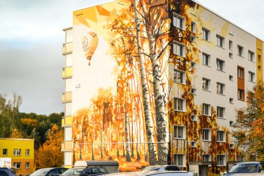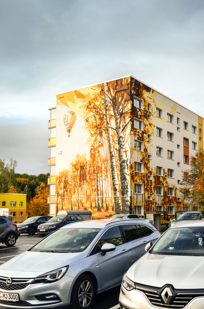 Diese Fassadengestaltung entstand nach einem Konzept von Markus Esche und Guido Günther. Das Gebäude befindet sich am Harthwald auf welchen die Motivwahl direkten Bezug nimmt. Da die vorhandene Umfeldbebauung in dominanten Orange & Gelbtönen angelegt war, entschieden wir uns für ein Herbstmotiv welches allmählich in den Hof des Gebäudekomplexes ausläuft und sich somit in die gegebene Bebauung harmonisch einfügt. Das nach links versetzte Zentrum der Malerei bot den Raum für das thematisch integrierte CI unseres Auftraggebers.