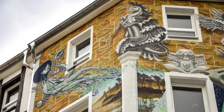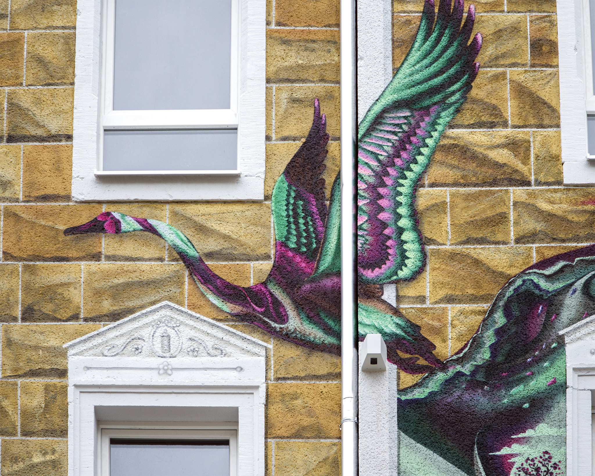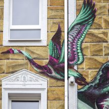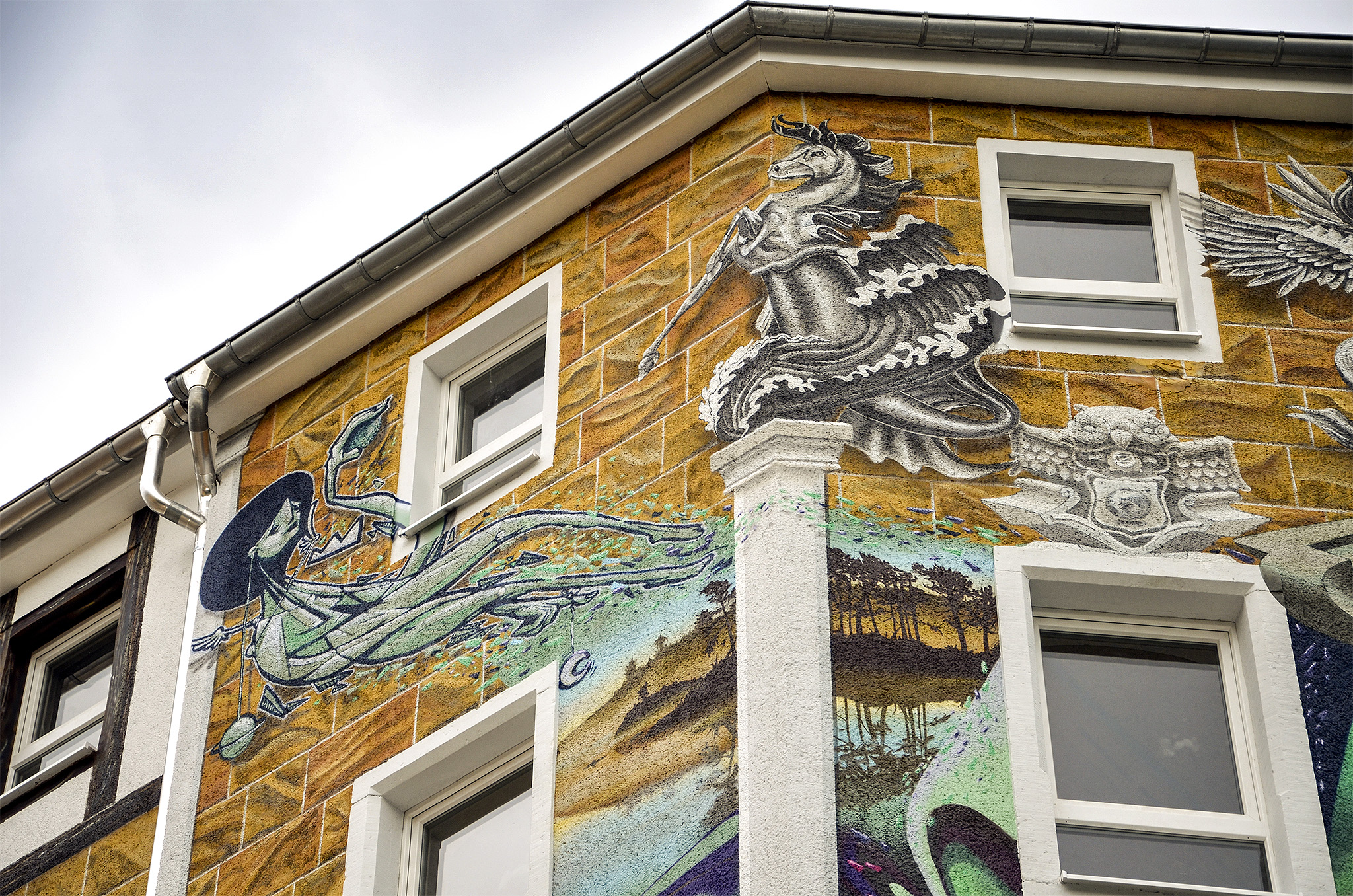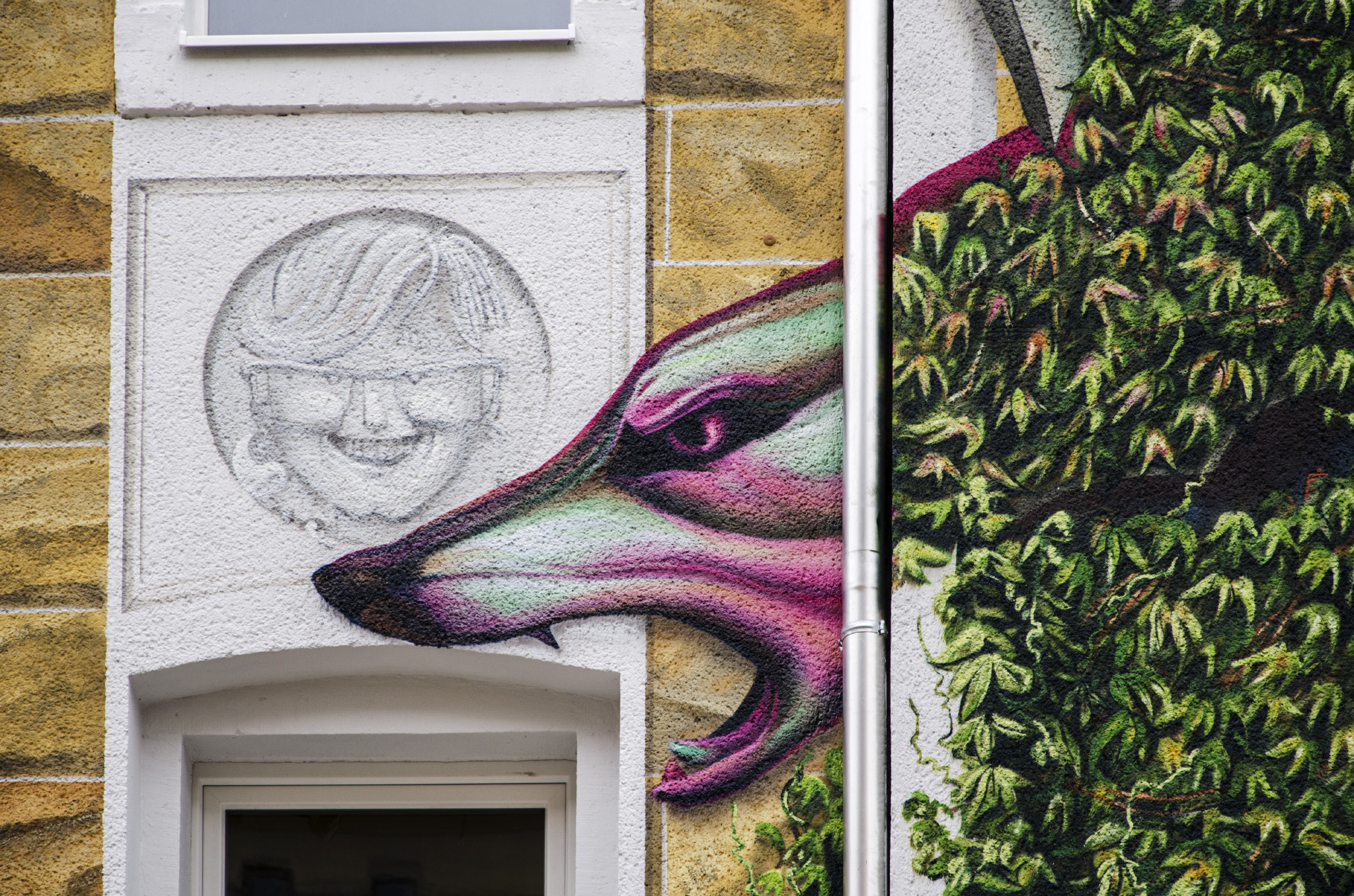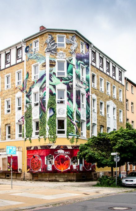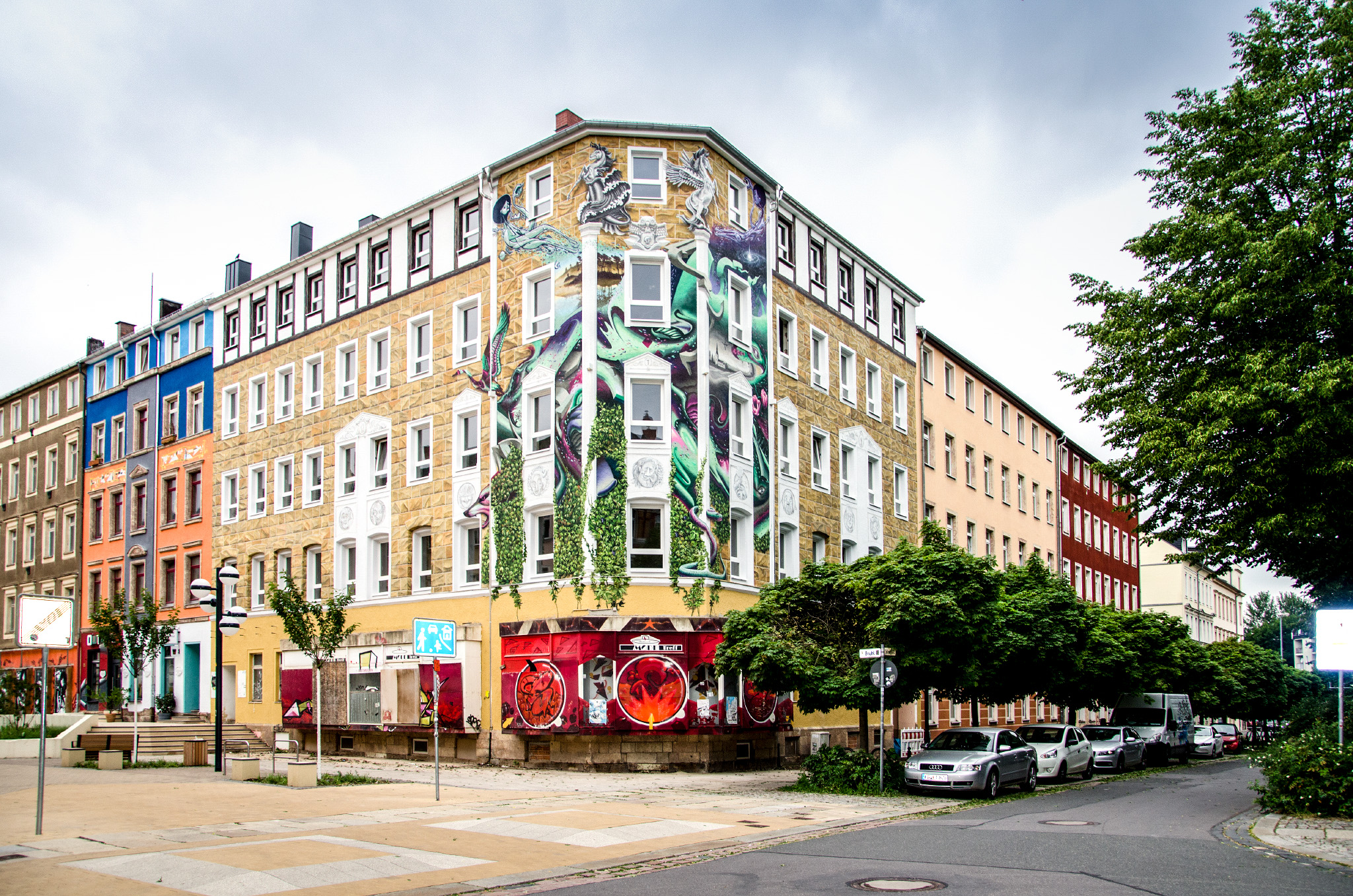 Dieses Objekt ist eine freie Arbeit von Markus Esche und Guido Günther. Das Gebäude am Zöllnerplatz 1 ist Eckhaus, Anfang und Ende einer Brühlgeschichte. Es ist Bestandteil eines Ensembles von in Summe fünf gestalteten Häusern am Brühl Kiez in Chemnitz und Teil des bis 2025 wachsenden Chemnitzer „Mural Trail“. Genau hinschauen lohnt sich, denn an dieser Fassade wurde mit viel Symbolik gearbeitet. So sind neben den Mitgliedern der Genossenschaft auch Elemente eingearbeit, die Herkunft und Konfession der Mitglieder stilisieren. Im Vordergrund auch dieser Gestaltung steht der Genossenschaftsgedanke. Die monumental anwirkende Fassade mit ihren Fachwerkelementen und Säulen huldigt auf ihre Art dem Handwerk, welches die Künstler als festen Bestandteil ihres Schaffens wahrnehmen.