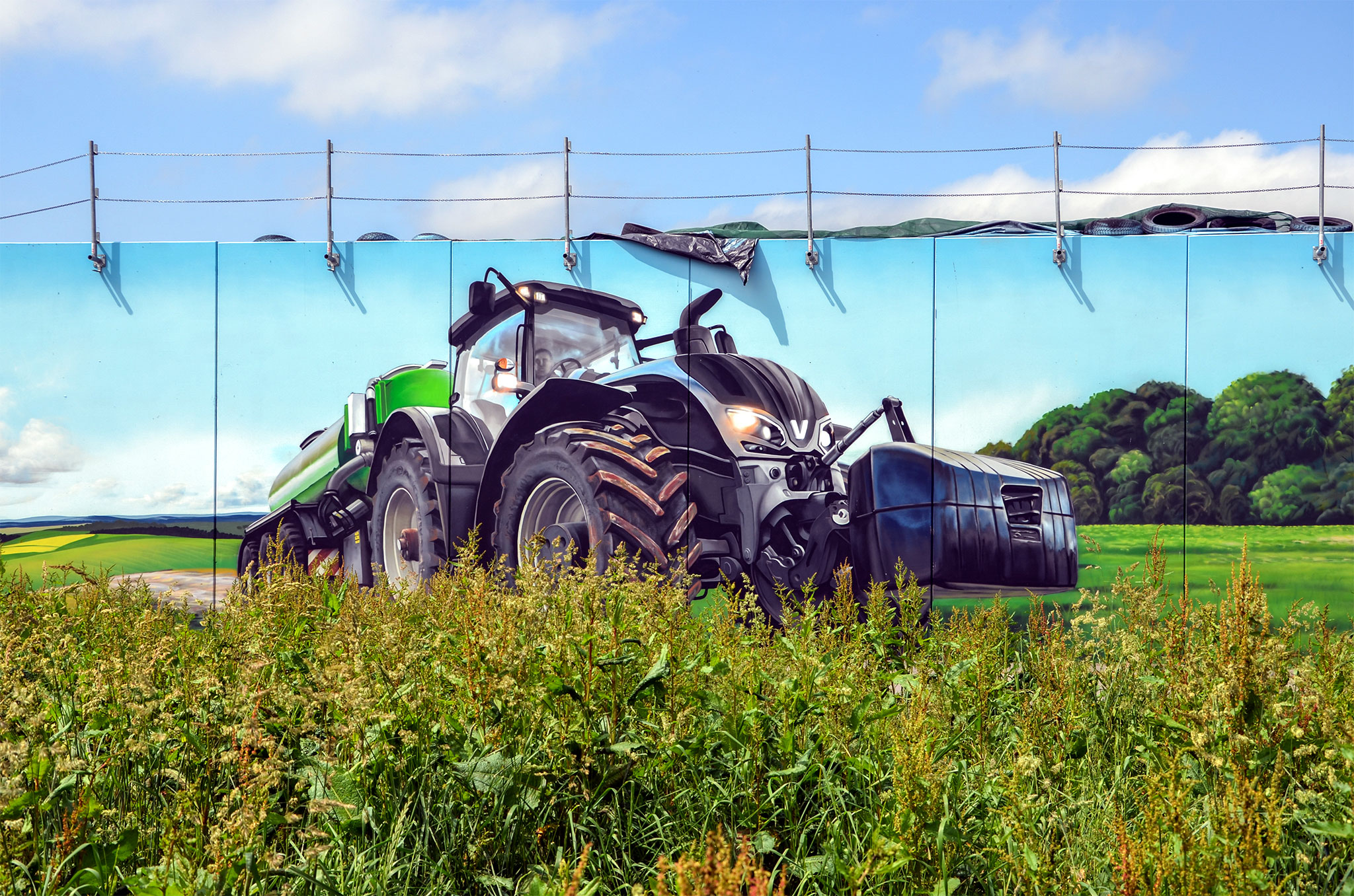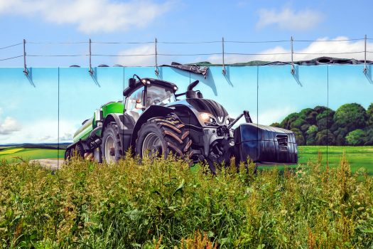 Die Aufgabenstellung hinter diesem Projekt lautete zwei Silos harmonisch in das landwirtschaftlich geprägte Umfeld zu integrieren. Die im Motiv dargestellten Maschinen und Tiere spiegeln den Alltag der Genossenschaft wieder.