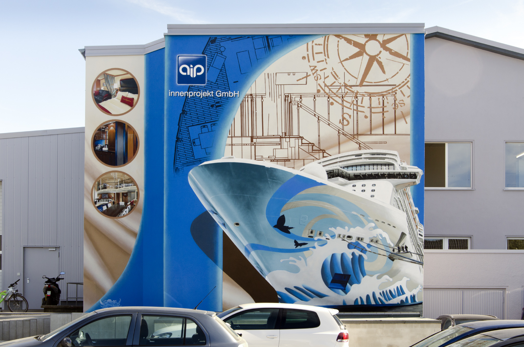 Leinen los! Dargestellt wurde hier bildlich der Schaffensbereich der Firma AIP aus Limbach welches sich mit dem Ausbau großer Schiffe & Yachten befasst. Realisiert wurde die Malerei von Markus Esche und Guido Günther.