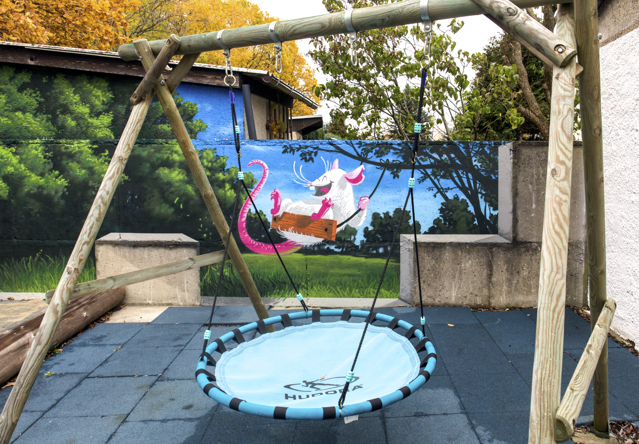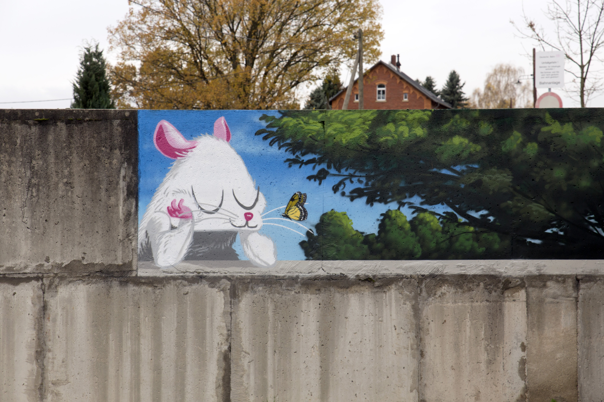 Graue Betonflächen bringen selten Kinderaugen zum Leuchten. So haben wir mit großer Freude dem „Mäusenest“ in Grüna eine Hand voll Mäuse, Käfer und Pflanzen in ihre Spieleecke gemalt um aus den grauen Betonflächen ein naturnahes Entdeckerland zu erschaffen.