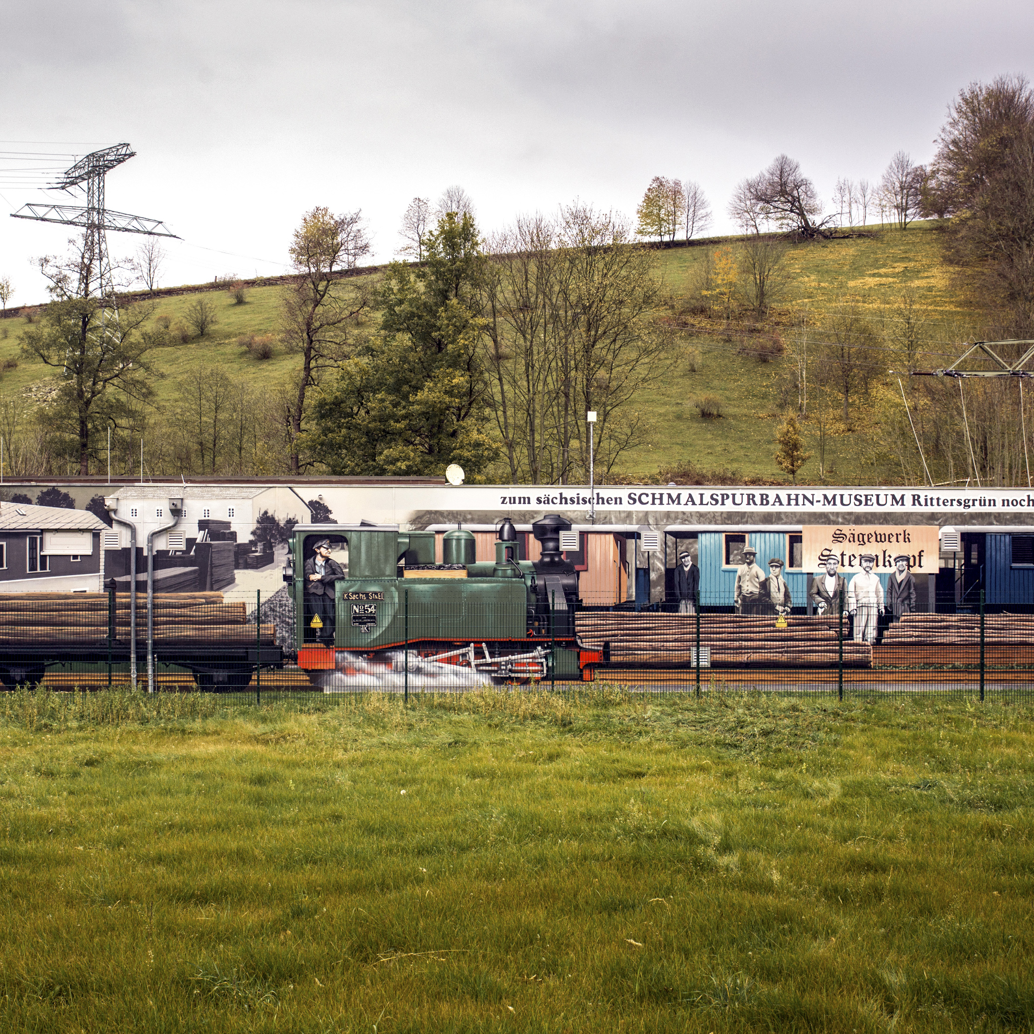 Dargestellt wurde hier die damals in dieser Region eingesetzte Schmalspurbahn. Am Standort des Umspannwerkes befand sich einst das Sägewerk Sternkopf für welches die Bahn das Holz herbeischaffte. Noch heute kann man im Schmalspurbahn-Museum Rittersgrün die Loks und Wagen dieser Zeit bewundern.