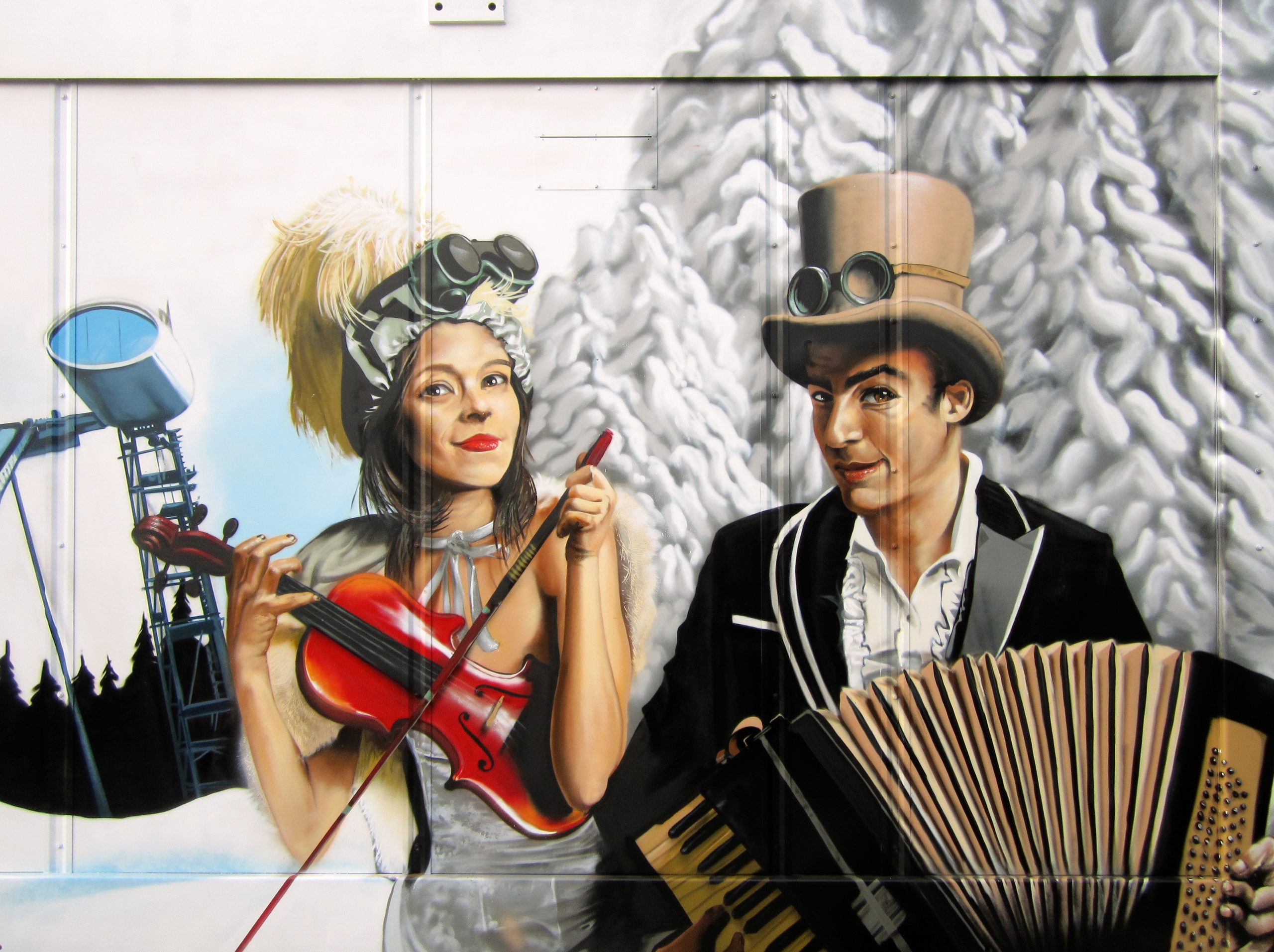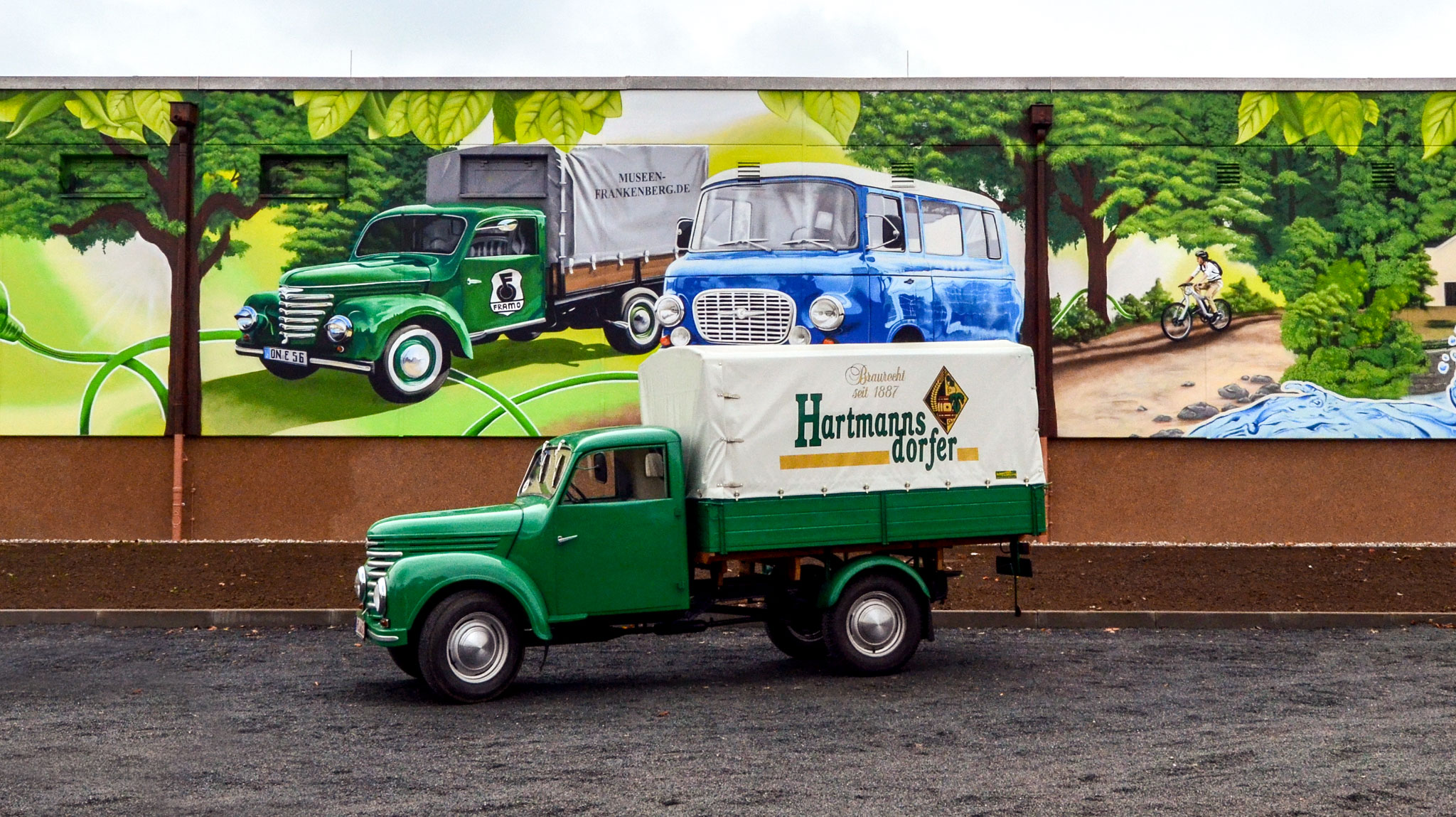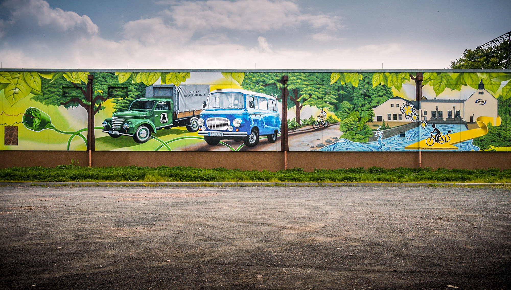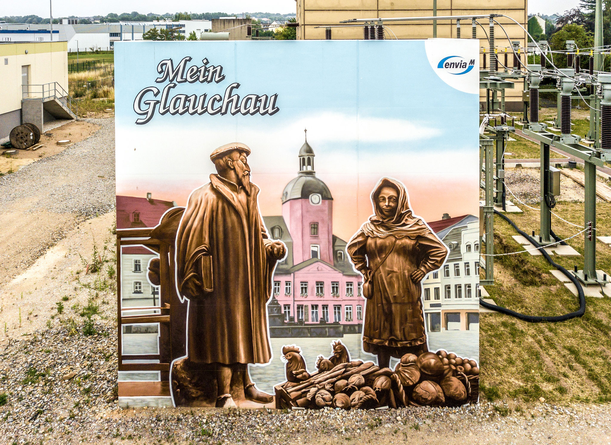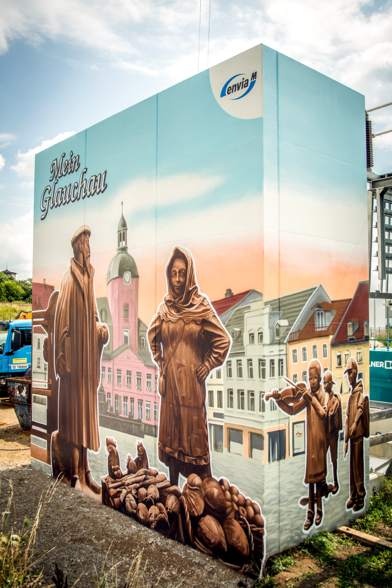 Auf dem Bild zu sehen ist der geschichtsträchtige Marktplatz in Glauchau. Angedeutet wird die markante rechteckige Form des Marktplatzes. Aufgegriffen ist die Marktfrau, die für den Handel steht und musizierende Kinder die das Leben von damals und heute symbolisieren. Doch den Herren sucht man am Marktplatz wohl vergeblich: Hier hat sich Georg Pawer auf die Fassade geschlichen, der vielen eher als Georgius Agricola ein Begriff sein sollte. Der in Glauchau geborene Gelehrte legte den Grundstein der modernen Natur- und Montanwissenschaften und hat sich so seinen Platz auf der Wand mehr als verdient.
