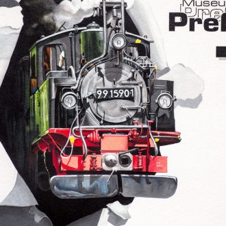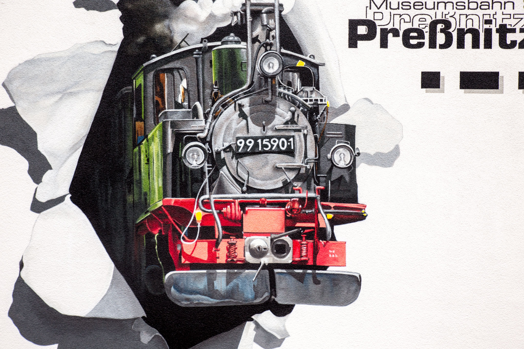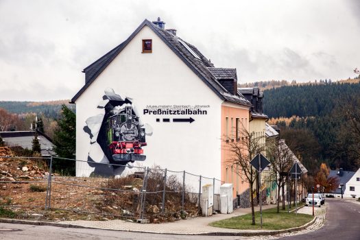 Diese Fassadenwerbung der Pressnitztalbahn bildet eine, der auf dieser historischen Route noch im Einsatz befindlichen, Dampfloks ab.